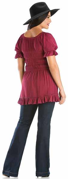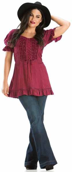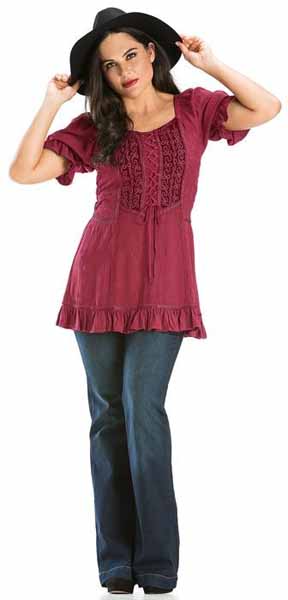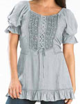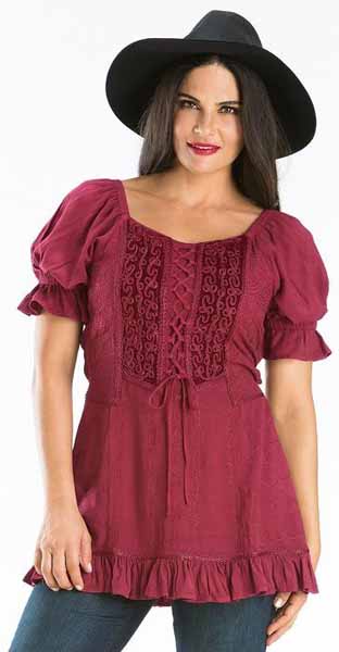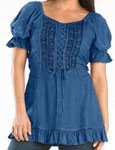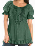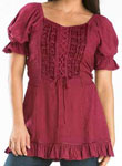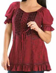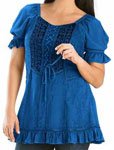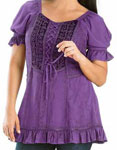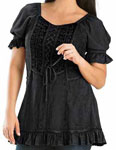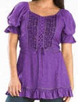 Toppen Kara har snörliv i en modell som påminner om sen medeltid eller tidig renässans men för att göra den modernt bekväm, har den resår bak. Kara är dekorerad med broderad sammet och vävda band, och har puffärmar, också de med resår. Tyget för övrigt är en underbart mjuk viskos. Kara har kort ärm och resår i ryggen. Hela framsidan av toppen är dekorerad och broderad. Den här toppen finns också i en långärmad version, Maya. Observera att modellerna inte har exakt samma mått. Om du har en storlek i Maya, kan du ändå behöva en annan storlek i Kara. |